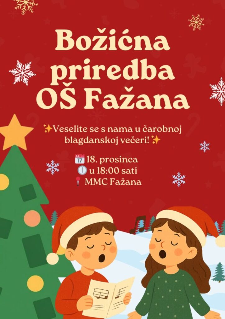s radošću vas pozivamo na Božićnu priredbu Osnovne škole Fažana, koja će se održati u Multimedijalnom centru Fažana (MMC), u četvrtak, 18. prosinca 2025. godine s početkom u 18 sati.